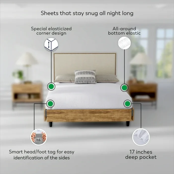 Deep-pocket design with smart head/foot tags ensures a snug fit and hassle-free bed-making.