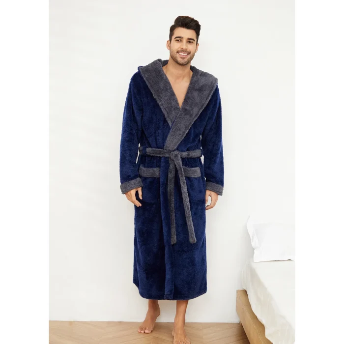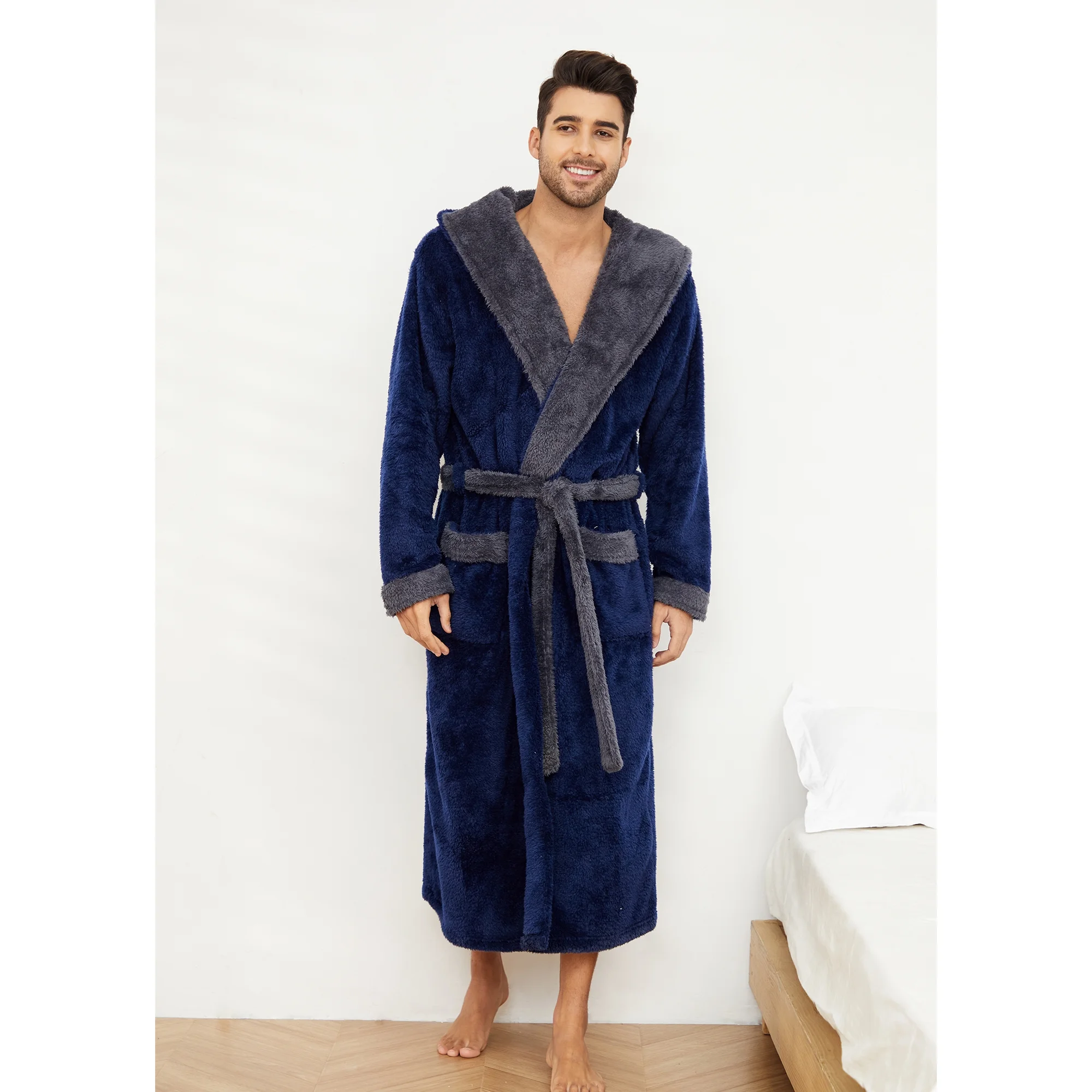 Home Bathrobes Linen lavish Mens Hooded Robe, Big and Tall Full Length Plush Robe for Men Long Fleece Bathrobe(Navy/Grey, Large-X-Large)