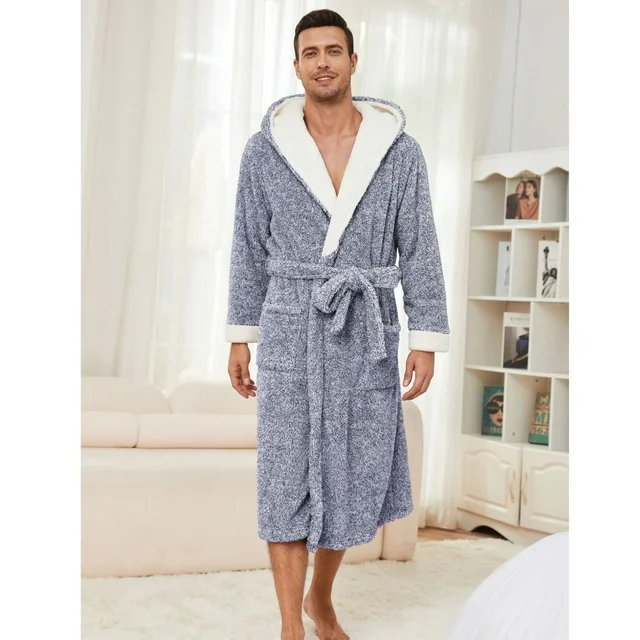 Home Bathrobes Linen Lavish Mens Plush Hooded Robe, Soft Fluffy Mens Fleece Robe Long Warm Men Bathrobes(Navy Mel., L/XL)
