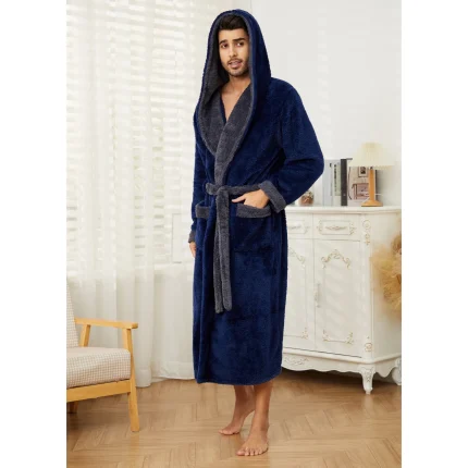Linen lavish Mens Hooded Robe, Big and Tall Full Length Plush Robe for Men Long Fleece Bathrobe(Navy/Grey, Large-X-Large)