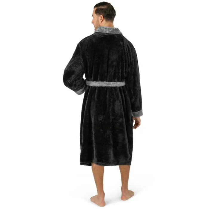 Linen Lavish Mens Soft Robe, Plush Fluffy Fleece Bathrobe for Men, Long Sherpa Spa Robe with Shawl Collar (Two-Tone Black)